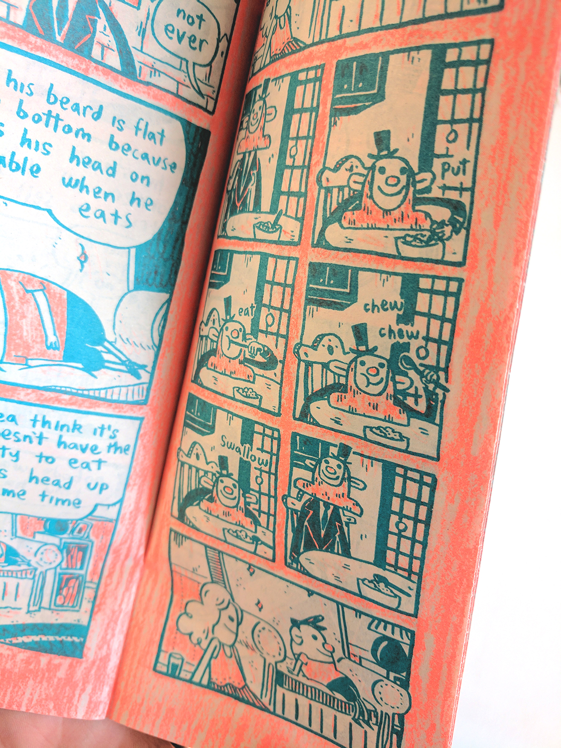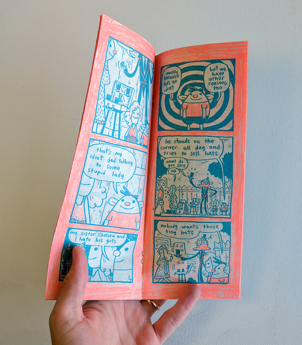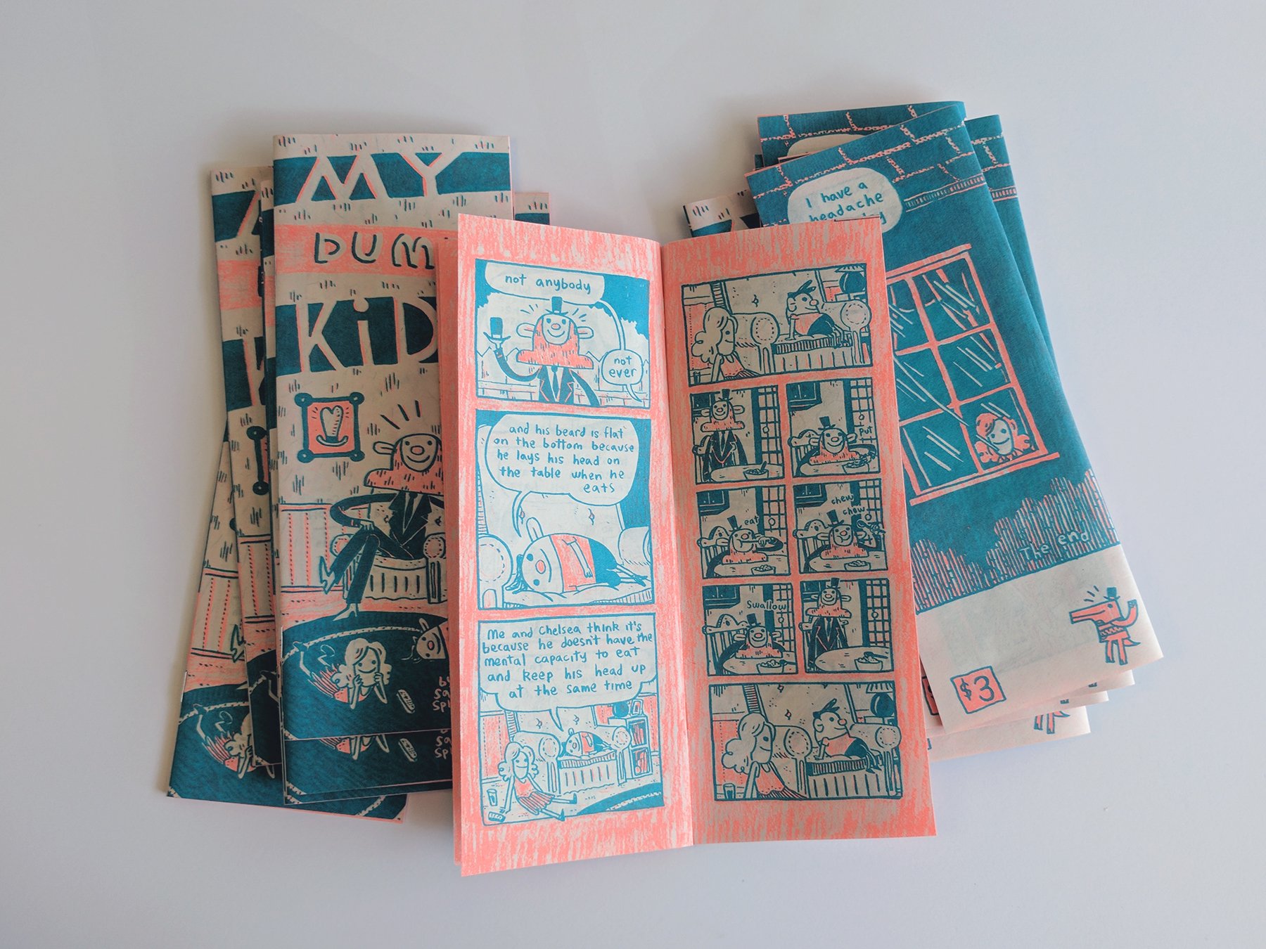 Meet Poppy Dudus and his family in My Dumb Kids; a self published and tall risoprinted two tone comic coming in at a smooooth 16 pages. Wow, what a funny, funny book, just wow, really. Could there possibly be some hidden truths about the relationship between parents and children? Maybe some Clinton conspiracy theories? Check it out and see 4 yourself.